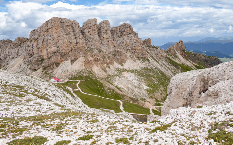 (ca. 11 km und 300 Höhenmeter, 1.200 Höhenmeter im Abstieg; Gehzeit: 4,5 h) - Tag 6: Langkofelhütte - Langkofelgruppe - Seiser Alm - Grasleitenpasshütte