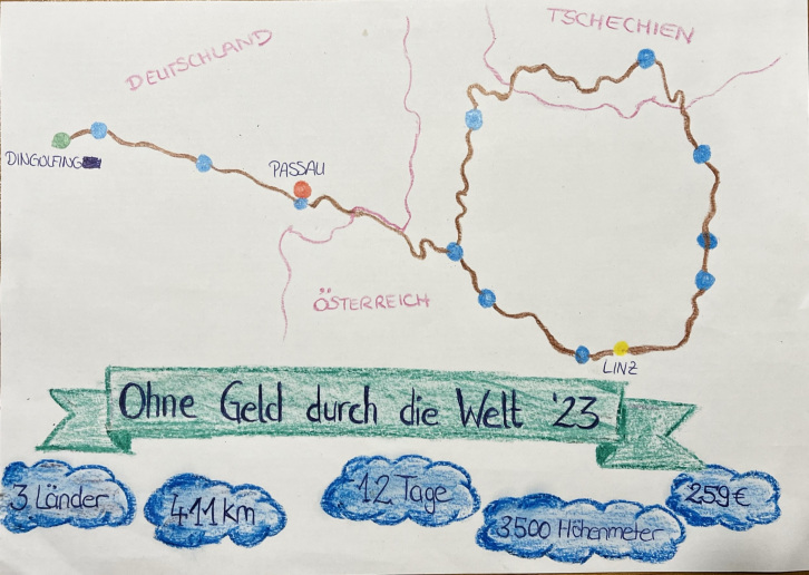 Die Begeisterung des KJR Dingolfing für unser Freizeitangebot "Ohne Geld durch die Welt" war so enorm, dass wir als Aventerra e.V. diesen Sommer eine exklusive Freizeit speziell für unseren Kooperationspartner KJR Dingolfing organisiert haben. Der Startpunkt für diese unvergessliche Reise war die malerische Stadt Passau am 20. August 2023. Von dort aus führte die Gruppe, begleitet von zwei unserer Erlebnispädagogen, entlang der Donau. Ihr Ziel? Der Moldaustausee in Tschechien, weiter über Neumarkt in Österreich nach Linz und schließlich zurück nach Passau und in die Heimatstadt Dingolfing. Insgesamt legten die Jugendlichen beeindruckende 420 Kilometer und 3.500 Höhenmeter auf ihren Fahrrädern zurück.