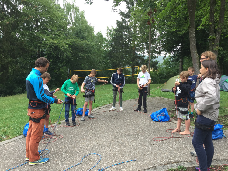 Am Freitag stand unser wohl spannendstes Programm auf der Agenda: Abseilen an der „Fensterlwand“. Was wir im Schuppen und auf unserem Zeltplatzgelände geübt hatten, durften die Jugendlichen nun am echten Felsen in luftiger Höhe in die Realität umsetzen. Alle Teilnehmer/innen seilten sich selbstständig aus ca. 30m Höhe über eine steile Felswand ab. Nach anfänglicher Nervosität waren alle von der Aktion begeistert und stolz, sich komplett alleine aus einer solchen Höhe abgeseilt zu haben. Zurück am Zeltplatz bauten wir die Zelte ab, da für Samstagmorgen Regen angekündigt wurde. Wir schlugen ein gemeinsames großes Lager im und vor dem Schuppen auf, in welchem wir dann alle zusammen mit Blick in den Sternenhimmel übernachteten.