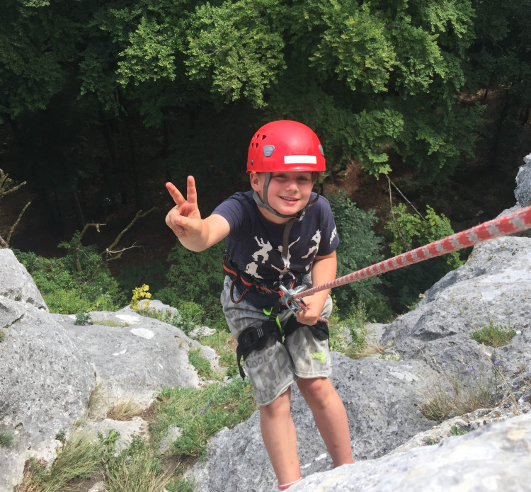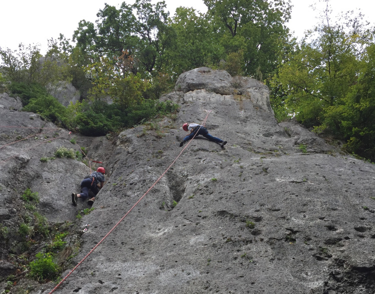 Am Montag starteten wir direkt mit Trockenübungen zum Thema Knotenkunde und Sichern mit dem Click-Up. Erstaunlich schnell hatten alle Teilnehmer/innen die Techniken verinnerlicht und der Wanderung zum Felsen „Lucky Luke“ stand nichts mehr im Weg. Dort kletterten und sicherten sich die Jugendlichen wie die Profis und schnell war klar: Für die Jungs und Mädels müssen am nächsten Tag schwerere Routen her!