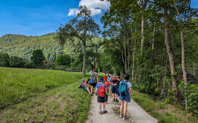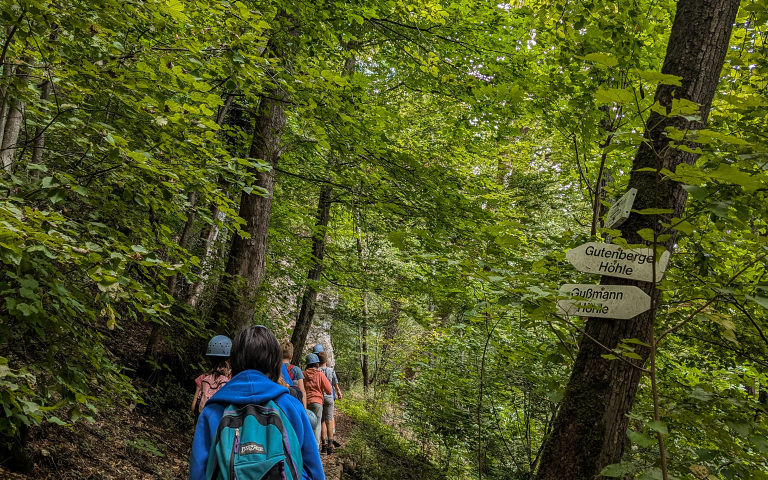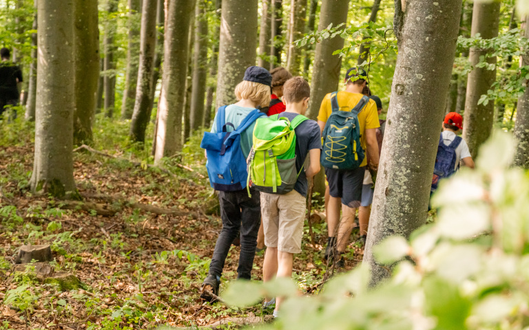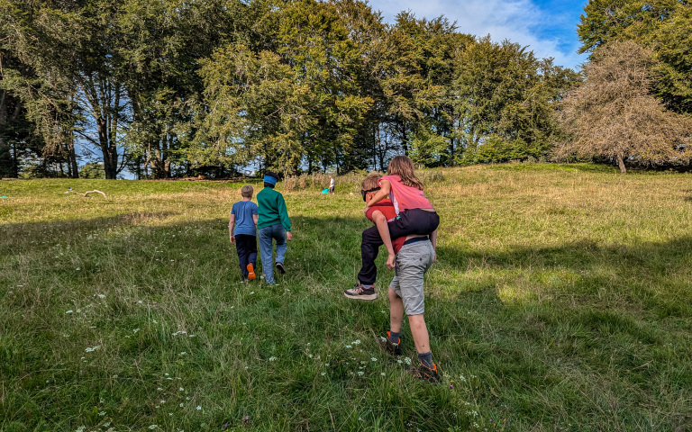 Die Kinder wandern gemeinsam mit den Trainer*innen etwa 2,5 km zur Hütte. Am Ende der Wanderung gibt es einen kurzen, steilen Anstieg zur Hütte. Das Gepäck wird vom Parkplatz zur Hütte transportiert.