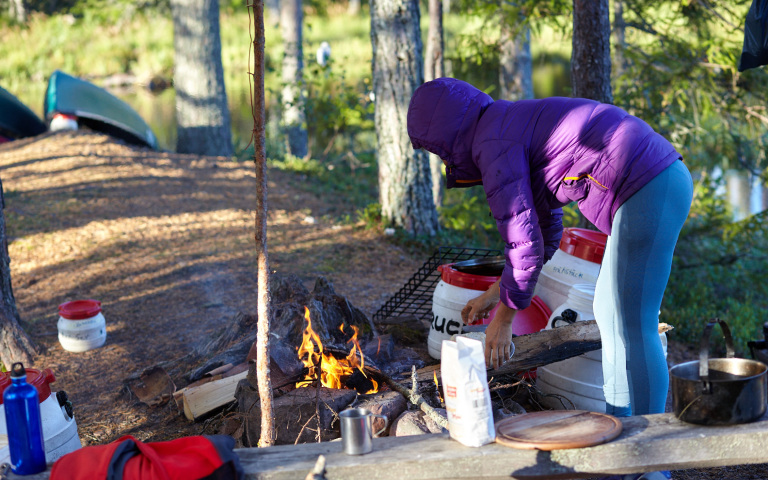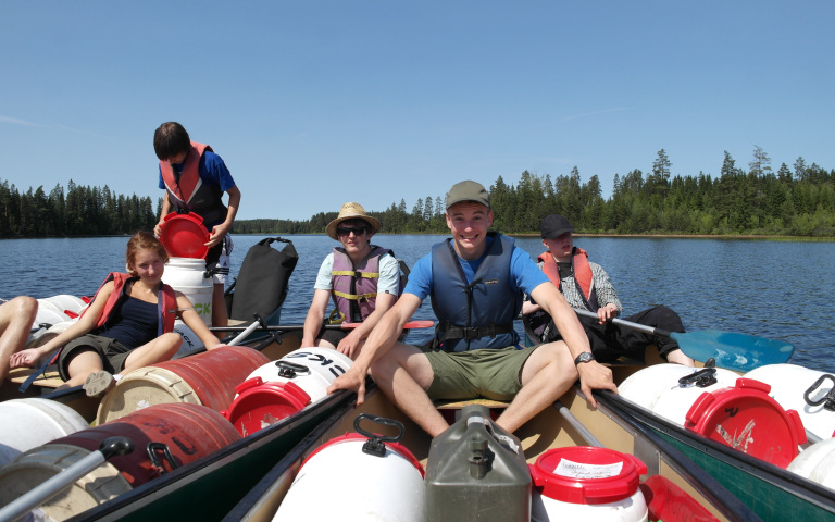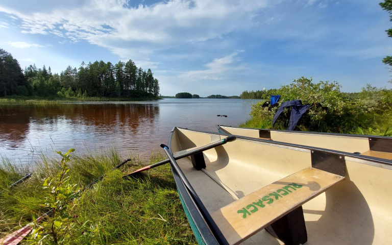Jetzt wird gepaddelt! Wir erkunden abgelegene Seen, die durch kleine Flussläufe miteinander verbunden sind. Kleine Stromschnellen und kurze „Portagen“ – bei denen wir die Boote gemeinsam über Land tragen – gehören ebenfalls dazu.