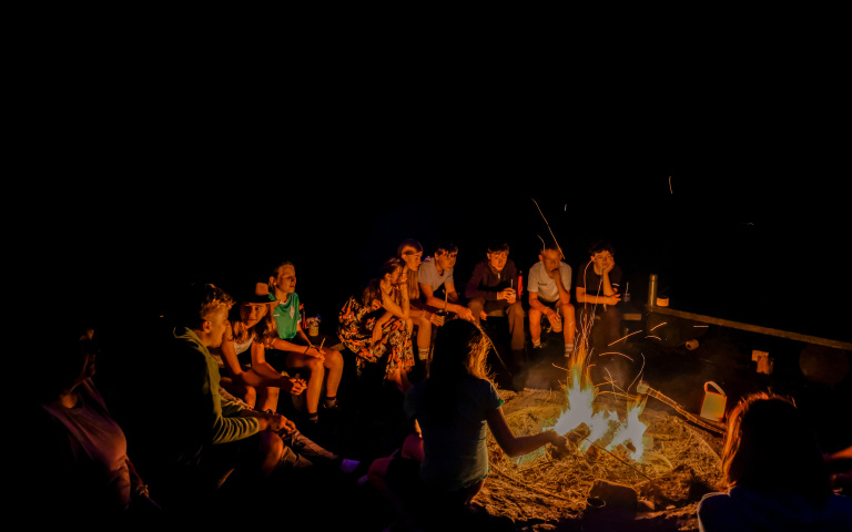 Am Abend entspannen wir uns am knisternden Feuer und tauschen Abenteuergeschichten aus. Das ist der perfekte Abschluss eines erlebnisreichen Tages im Wald.
